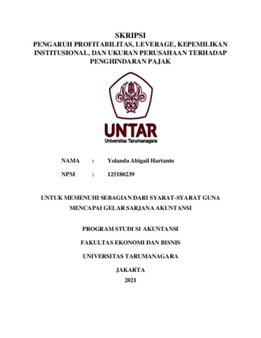 Hartanto, Yolanda Abigail (2021) PENGARUH PROFITABILITAS, LEVERAGE, KEPEMILIKAN INSTITUSIONAL, DAN UKURAN PERUSAHAAN TERHADAP PENGHINDARAN PAJAK. Skripsi thesis, Universitas Tarumanagara.