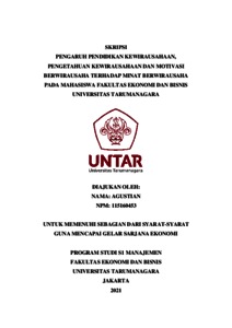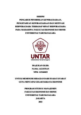 AGUSTIAN, AGUSTIAN (2021) PENGARUH PENDIDIKAN KEWIRAUSAHAAN, PENGETAHUAN KEWIRAUSAHAAN DAN MOTIVASI BERWIRAUSAHA TERHADAP MINAT BERWIRAUSAHA PADA MAHASISWA FAKULTAS EKONOMI DAN BISNIS UNIVERSITAS TARUMANAGARA. Skripsi thesis, Universitas Tarumanagara.