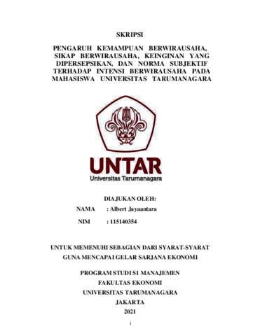 Jayaantara, Albert (2021) PENGARUH KEMAMPUAN BERWIRAUSAHA, SIKAP BERWIRAUSAHA, KEINGINAN YANG DIPERSEPSIKAN, DAN NORMA SUBJEKTIF dTERHADAP INTENSI BERWIRAUSAHA PADA MAHASISWA UNIVERSITAS dTARUMANAGARA. Skripsi thesis, Universitas Tarumanagara.