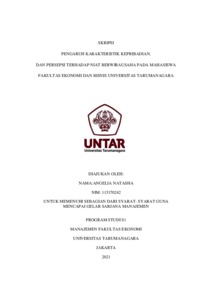 NATASHA, ANGELIA (2021) PENGARUH KARAKTERISTIK KEPRIBADIAN, DAN PERSEPSI TERHADAP NIAT BERWIRAUSAHA PADA MAHASISWA FAKULTAS EKONOMI DAN BISNIS UNIVERSITAS TARUMANAGARA. Skripsi thesis, Universitas Tarumanagara.