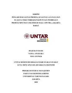 ANGELIKA, ANGELIKA (2021) PENGARUH KUALITAS PRODUK, KUALITAS LAYANAN, DAN SUASANA TOKO TERHADAP KEPUTUSAN PEMBELIAN PRODUK MINUMAN CHATIME DI MALL CIPUTRA, JAKARTA BARAT. Skripsi thesis, Universitas Tarumanagara.