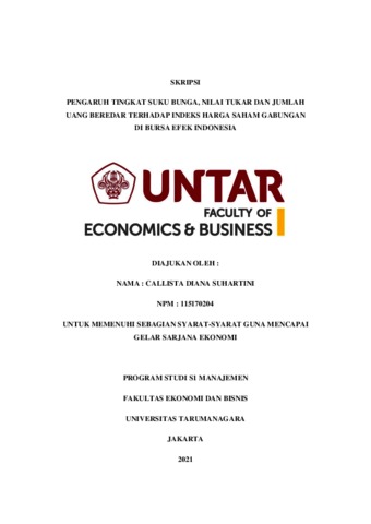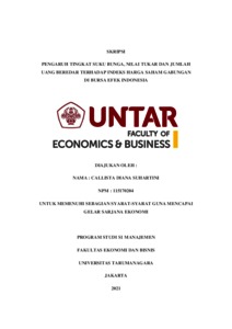 SUHARTINI, CALLISTA DIANA (2021) PENGARUH TINGKAT SUKU BUNGA, NILAI TUKAR DAN JUMLAH UANG BEREDAR TERHADAP INDEKS HARGA SAHAM GABUNGAN DI BURSA EFEK INDONESIA. Skripsi thesis, Universitas Tarumanagara.