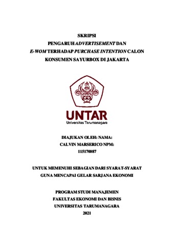 MARSERICO, CALVIN (2021) PENGARUH ADVERTISEMENT DAN E-WOM TERHADAP PURCHASE INTENTION CALON KONSUMEN SAYURBOX DI JAKARTA. Skripsi thesis, Universitas Tarumanagara.