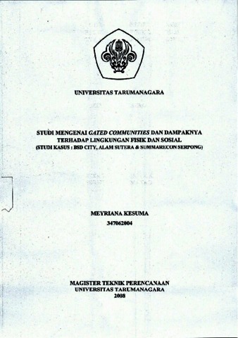 Meyriana Kesuma, tesis (2008) Studi Mengenai Gated Communities Dan Dapaknya Terhadap Pingkungan Fisik Dan Sosial. Masters thesis, UNTAR.