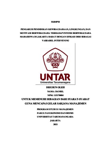 DANIEL, DANIEL (2021) PENGARUH PENDIDIKAN KEWIRAUSAHAAN, LINGKUNGAN, DAN MOTIVASI BERWIRAUSAHA TERHADAP INTENSI BERWIRAUSAHA MAHASISWA DI JAKARTA BARAT DENGAN EFIKASI DIRI SEBAGAI VARIABEL INTERVENING. Skripsi thesis, Universitas Tarumanagara.