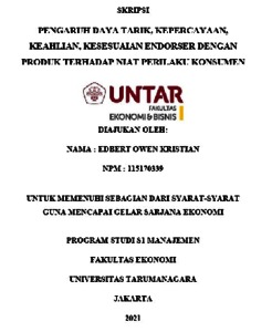 KRISTIAN, EDBERT OWEN (2021) PENGARUH DAYA TARIK, KEPERCAYAAN, KEAHLIAN, KESESUAIAN ENDORSER DENGAN PRODUK TERHADAP NIAT PERILAKU KONSUMEN. Skripsi thesis, Universitas Tarumanagara.