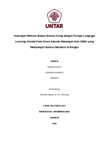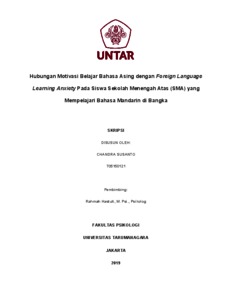 Susanto, Chandra (2022) Hubungan Foreign Language Learning Anxiety dan Motivasi Belajar Bahasa Asing pada Siswa Sekolah Menengah Atas (SMA) yang Mempelajari Bahasa Mandarin. Skripsi thesis, Universitas Tarumanagara.