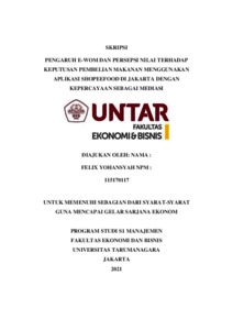 YOHANSYAH, FELIX (2021) PENGARUH E-WOM DAN PERSEPSI NILAI TERHADAP KEPUTUSAN PEMBELIAN MAKANAN MENGGUNAKAN APLIKASI SHOPEEFOOD DI JAKARTA DENGAN KEPERCAYAAN SEBAGAI MEDIASI. Skripsi thesis, Universitas Tarumanagara.