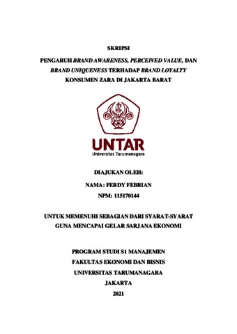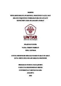 FEBRIAN, FERDY (2021) PENGARUH BRAND AWARENESS, PERCEIVED VALUE, DAN BRAND UNIQUENESS TERHADAP BRAND LOYALTY KONSUMEN ZARA DI JAKARTA BARAT. Skripsi thesis, Universitas Tarumanagara.