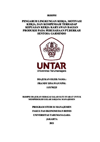 ISNAWAN, FRANDY (2021) PENGARUH LINGKUNGAN KERJA, MOTIVASI KERJA, DAN KOMPENSASI TERHADAP KEPUASAN KERJA KARYAWAN BAGIAN PRODUKSI PADA PERUSAHAAN PT.BERKAH SENTOSA GARMINDO. Skripsi thesis, Universitas Tarumanagara.