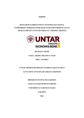 TRANOYA NTUH, HEMLI (2021) PENGARUH FASHION INNOVATIVENESS DAN SOCIAL COMPARISON TERHADAP PURCHASE INTENTION PRODUK GUCCI DENGAN BRAND ATTITUDE SEBAGAI VARIABEL MEDIASI. Skripsi thesis, Universitas Tarumanagara.