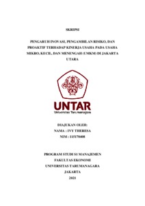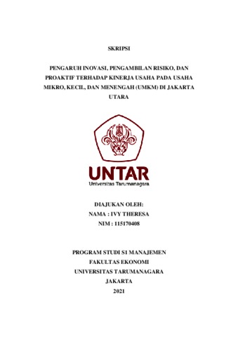 THERESA, IVY (2021) PENGARUH INOVASI, PENGAMBILAN RISIKO, DAN PROAKTIF TERHADAP KINERJA USAHA PADA USAHA MIKRO, KECIL, DAN MENENGAH (UMKM) DI JAKARTA UTARA. Skripsi thesis, Universitas Tarumanagara.