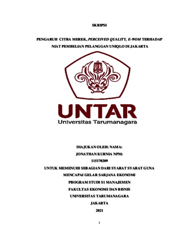KURNIA, JONATHAN (2021) PENGARUH CITRA MEREK, PERCEIVED QUALITY, E-WOM TERHADAP NIAT PEMBELIAN PELANGGAN UNIQLO DI JAKARTA. Skripsi thesis, Universitas Tarumanagara.