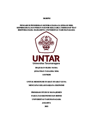 TANAZHA, JONATHAN (2021) PENGARUH PENDIDIKAN KEWIRAUSAHAAN, EFIKASI DIRI, KEPRIBADIAN, DAN PERAN FAKTOR KELUARGA TERHADAP NIAT BERWIRAUSAHA MAHASISWA UNIVERSITAS TARUMANAGARA. Skripsi thesis, Universitas Tarumanagara.