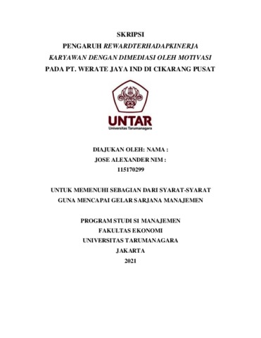 ALEXANDER, JOSE (2021) PENGARUH REWARD TERHADAP KINERJA KARYAWAN DENGAN DIMEDIASI OLEH MOTIVASI PADA PT. WERATE JAYA IND DI CIKARANG PUSAT. Skripsi thesis, Universitas Tarumanagara.