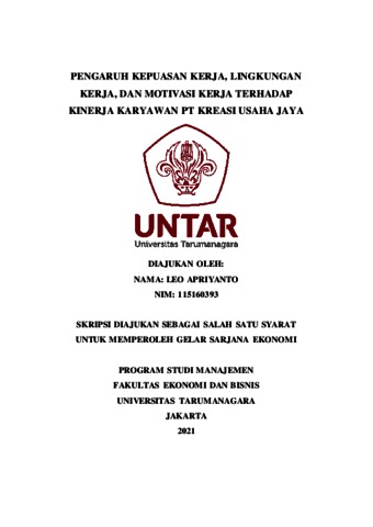 APRIYANTO, LEO (2021) PENGARUH KEPUASAN KERJA, LINGKUNGAN KERJA, DAN MOTIVASI KERJA TERHADAP KINERJA KARYAWAN PT KREASI USAHA JAYA. Skripsi thesis, Universitas Tarumanagara.