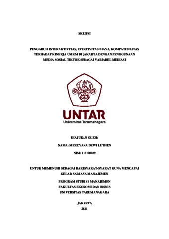 LUTHEN, MERCYANA DEWI (2021) PENGARUH INTERAKTIVITAS, EFEKTIVITAS BIAYA, KOMPATIBILITAS TERHADAP KINERJA UMKM DI JAKARTA DENGAN PENGGUNAAN MEDIA SOSIAL TIKTOK SEBAGAI VARIABEL MEDIASI. Skripsi thesis, Universitas Tarumanagara.