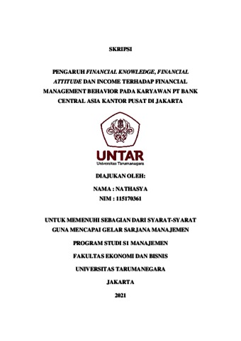 NATHASYA, NATHASYA (2021) PENGARUH FINANCIAL KNOWLEDGE, FINANCIAL ATTITUDE DAN INCOME TERHADAP FINANCIAL MANAGEMENT BEHAVIOR PADA KARYAWAN PT BANK CENTRAL ASIA KANTOR PUSAT DI JAKARTA. Skripsi thesis, Universitas Tarumanagara.