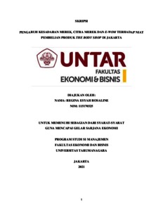 ROSALINE, REGINA ESYAH (2021) PENGARUH KESADARAN MEREK, CITRA MEREK DAN E-WOM TERHADAP NIAT PEMBELIAN PRODUK THE BODY SHOP DI JAKARTA. Skripsi thesis, Universitas Tarumanagara.