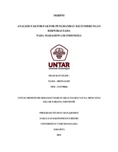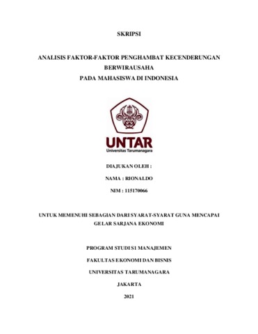 RIONALDO, RIONALDO (2021) ANALISIS FAKTOR-FAKTOR PENGHAMBAT KECENDERUNGAN BERWIRAUSAHA PADA MAHASISWA DI INDONESIA. Skripsi thesis, Universitas Tarumanagara.
