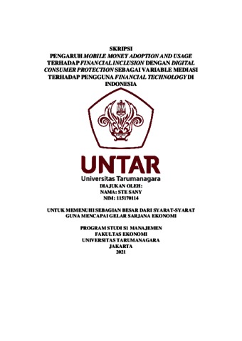 SANY, STE (2021) PENGARUH MOBILE MONEY ADOPTION AND USAGE TERHADAP FINANCIAL INCLUSION DENGAN DIGITAL CONSUMER PROTECTION SEBAGAI VARIABLE MEDIASI TERHADAP PENGGUNA FINANCIAL TECHNOLOGY DI INDONESIA. Skripsi thesis, Universitas Tarumanagara.