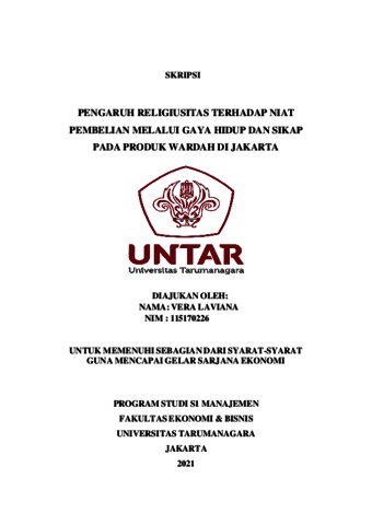 LAVIANA, VERA (2021) PENGARUH RELIGIUSITAS TERHADAP NIAT PEMBELIAN MELALUI GAYA HIDUP DAN SIKAP PADA PRODUK WARDAH DI JAKARTA. Skripsi thesis, Universitas Tarumanagara.