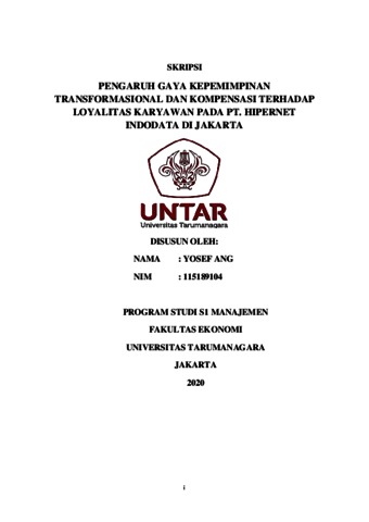 YOSEF ANG, YOSEF ANG (2021) PENGARUH GAYA KEPEMIMPINAN TRANSFORMASIONAL DAN KOMPENSASI TERHADAP LOYALITAS KARYAWAN PADA PT. HIPERNET INDODATA DI JAKARTA. Skripsi thesis, Universitas Tarumanagara.