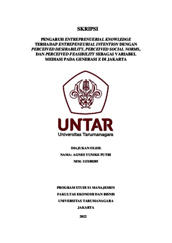 PUTRI, AGNES YUNIKE (2022) PENGARUH ENTREPRENUERIAL KNOWLEDGE TERHADAP ENTREPENEURIAL INTENTION DENGAN PERCEIVED DESIRABILITY, PERCEIVED SOCIAL NORMS, DAN PERCEIVED FEASIBILITY SEBAGAI VARIABEL MEDIASI PADA GENERASI Z DI JAKARTA. Skripsi thesis, Universitas Tarumanagara.