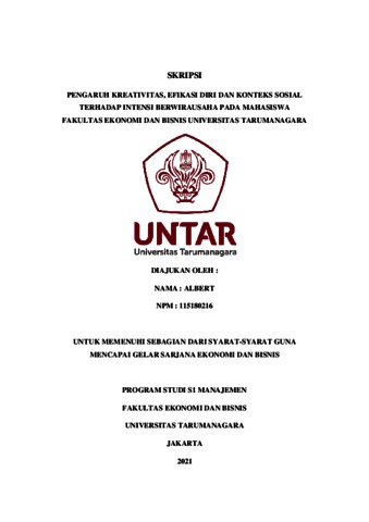 ALBERT, ALBERT (2022) PENGARUH KREATIVITAS, EFIKASI DIRI DAN KONTEKS SOSIAL TERHADAP INTENSI BERWIRAUSAHA PADA MAHASISWA FAKULTAS EKONOMI DAN BISNIS UNIVERSITAS TARUMANAGARA. Skripsi thesis, Universitas Tarumanagara.