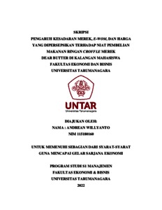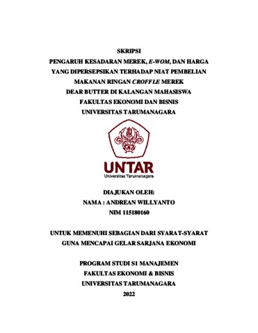 WILLYANTO, ANDREAN (2022) PENGARUH KESADARAN MEREK, E-WOM, DAN HARGA YANG DIPERSEPSIKAN TERHADAP NIAT PEMBELIAN MAKANAN RINGAN CROFFLE MEREK DEAR BUTTER DI KALANGAN MAHASISWA FAKULTAS EKONOMI DAN BISNIS UNIVERSITAS TARUMANAGARA. Skripsi thesis, Universitas Tarumanagara.