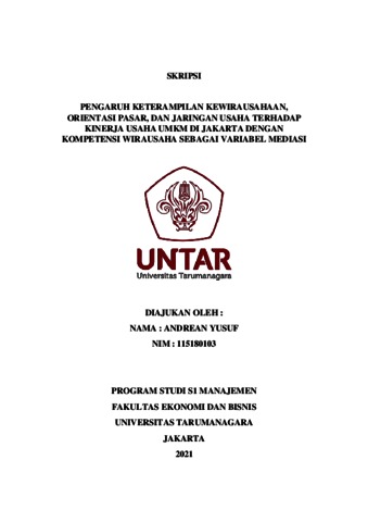 YUSUF, ANDREAN (2022) PENGARUH KETERAMPILAN KEWIRAUSAHAAN, ORIENTASI PASAR, DAN JARINGAN USAHA TERHADAP KINERJA USAHA UMKM DI JAKARTA DENGAN KOMPETENSI WIRAUSAHA SEBAGAI VARIABEL MEDIASI. Skripsi thesis, Universitas Tarumanagara.