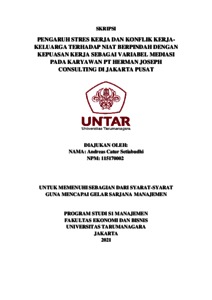 Setiabudhi, Andreas Catur (2022) PENGARUH STRES KERJA DAN KONFLIK KERJA-KELUARGA TERHADAP NIAT BERPINDAH DENGAN KEPUASAN KERJA SEBAGAI VARIABEL MEDIASI PADA KARYAWAN PT HERMAN JOSEPH CONSULTING DI JAKARTA PUSAT. Skripsi thesis, Universitas Tarumanagara.