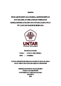FRANSISKA, ATALYA (2021) PENGARUH KEPUASAN KERJA, KEPEMIMPINAN DAN KEADILAN ORGANISASI TERHADAP KESEJAHTERAAN KARYAWAN PADA KARYAWAN PT LANCAR MAKMUR BERSAMA. Skripsi thesis, Universitas Tarumanagara.