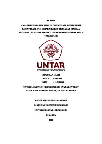 Ban Hin, Ban Hin (2021) ANALISIS PENGARUH BUDAYA ORGANISASI, KOMPETENSI KOMUNIKASI DAN DISIPLIN KERJA TERHADAP KINERJA PEGAWAI USAHA MIKRO KECIL MENENGAH (UMKM) DI KOTA TANGERANG. Skripsi thesis, Universitas Tarumanagara.