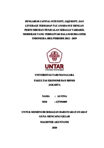 Alvina, Alvina (2020) PENGARUH CAPITAL INTENSITY, LIQUIDITY, DAN LEVERAGE TERHADAP TAX AVOIDANCE DENGAN PERTUMBUHAN PENJUALAN SEBAGAI VARIABEL MODERASI YANG TERDAFTAR DALAM BURSA EFEK INDONESIA (BEI) PERIODE 2012 - 2019. Masters thesis, UNIVERSITAS TARUMANAGARA.