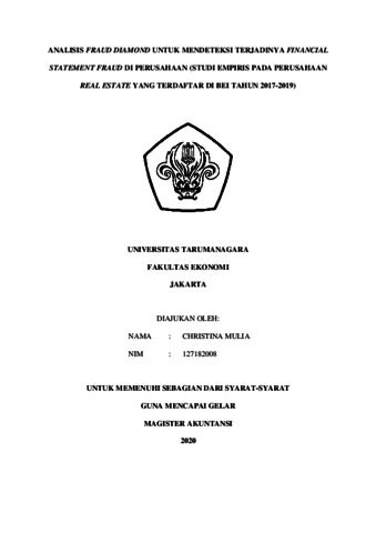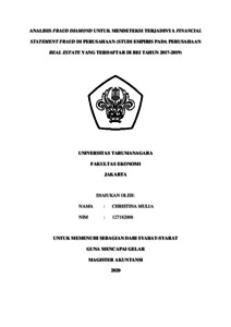 Mulia, Christina (2020) ANALISIS FRAUD DIAMOND UNTUK MENDETEKSI TERJADINYA FINANCIAL STATEMENT FRAUD DI PERUSAHAAN (STUDI EMPIRIS PADA PERUSAHAAN REAL ESTATE YANG TERDAFTAR DI BEI TAHUN 2017-2019). Masters thesis, UNIVERSITAS TARUMANAGARA.