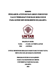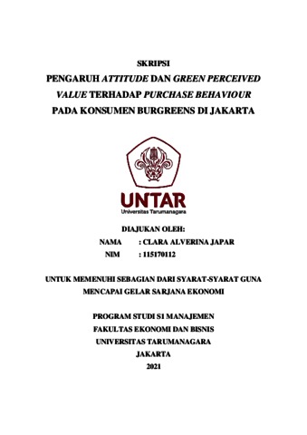 JAPAR, CLARA ALVERINA (2022) PENGARUH ATTITUDE DAN GREEN PERCEIVED VALUE TERHADAP PURCHASE BEHAVIOUR PADA KONSUMEN BURGREENS DI JAKARTA. Skripsi thesis, Universitas Tarumanagara.