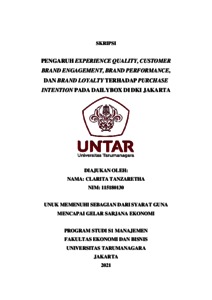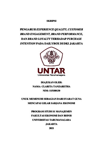TANZARETHA, CLARITA (2021) PENGARUH EXPERIENCE QUALITY, CUSTOMER BRAND ENGAGEMENT, BRAND PERFORMANCE, DAN BRAND LOYALTY TERHADAP PURCHASE INTENTION PADA DAILYBOX DI DKI JAKARTA. Skripsi thesis, Universitas Tarumanagara.
