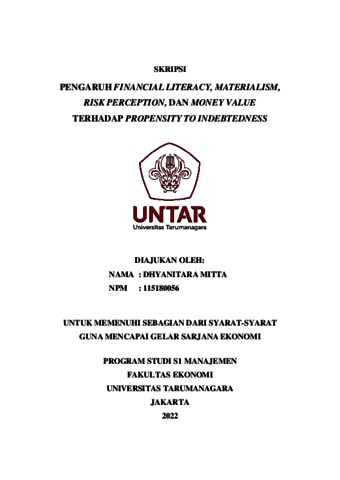 MITTA, DHYANITARA (2021) PENGARUH FINANCIAL LITERACY, MATERIALISM, RISK PERCEPTION, DAN MONEY VALUE TERHADAP PROPENSITY TO INDEBTEDNESS. Skripsi thesis, Universitas Tarumanagara.