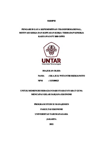 RIZKIANOTO, EKA JULI WITANTRI (2022) PENGARUH GAYA KEPEMIMPINAN TRANSFORMASIONAL, MOTIVASI KERJA DAN KEPUASAN KERJA TERHADAP KINERJA KARYAWAN PT SBB OPPO. Skripsi thesis, Universitas Tarumanagara.