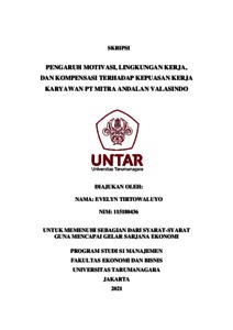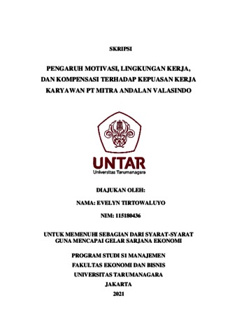 TIRTOWALUYO, EVELYN (2022) PENGARUH MOTIVASI, LINGKUNGAN KERJA, DAN KOMPENSASI TERHADAP KEPUASAN KERJA KARYAWAN PT MITRA ANDALAN VALASINDO. Skripsi thesis, Universitas Tarumanagara.