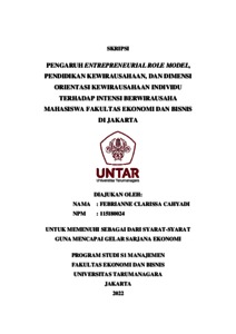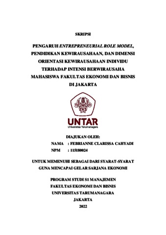 CAHYADI, FEBRIANNE CLARISSA (2022) PENGARUH ENTREPRENEURIAL ROLE MODEL, PENDIDIKAN KEWIRAUSAHAAN, DAN DIMENSI ORIENTASI KEWIRAUSAHAAN INDIVIDU TERHADAP INTENSI BERWIRAUSAHA MAHASISWA FAKULTAS EKONOMI DAN BISNIS DI JAKARTA. Skripsi thesis, Universitas Tarumanagara.