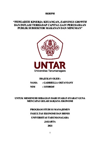OKTAVIANY, GABRIELLA (2022) PENGARUH KINERJA KEUANGAN, EARNINGS GROWTH DAN INFLASI TERHADAP CAPITAL GAIN PERUSAHAAN PUBLIK SUBSEKTOR MAKANAN DAN MINUMAN. Skripsi thesis, Universitas Tarumanagara.