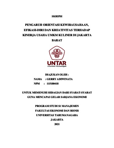 ADIWINATA, GERRY (2022) PENGARUH ORIENTASI KEWIRAUSAHAAN, EFIKASI-DIRI DAN KREATIVITAS TERHADAP KINERJA USAHA UMKM KULINER DI JAKARTA BARAT. Skripsi thesis, Universitas Tarumanagara.