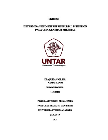 WIDIANTO, HANDI (2021) DETERMINAN ECO-ENTREPRENEURIAL INTENTION PADA USIA GENERASI MILENIAL. Skripsi thesis, Universitas Tarumanagara.