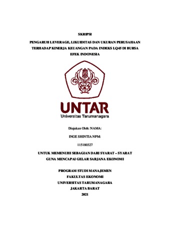 SHINTIA, INGE (2021) PENGARUH LEVERAGE, LIKUIDITAS DAN UKURAN PERUSAHAAN TERHADAP KINERJA KEUANGAN PADA INDEKS LQ45 DI BURSA EFEK INDONESIA. Skripsi thesis, Universitas Tarumanagara.