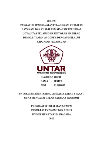 JESICA, JESICA (2022) PENGARUH PENGALAMAN PELANGGAN, KUALITAS LAYANAN, DAN KUALITAS MAKANAN TERHADAP LOYALITAS PELANGGAN RESTORAN HAIDILAO DI MALL TAMAN ANGGREK DENGAN MELALUI KEPUASAN PELANGGAN. Skripsi thesis, Universitas Tarumanagara.