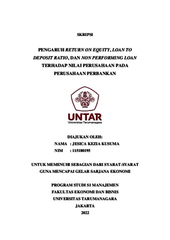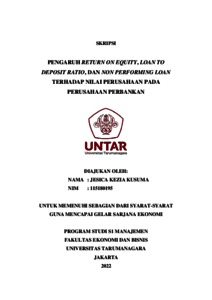 KUSUMA, JESICA KEZIA (2022) PENGARUH RETURN ON EQUITY, LOAN TO DEPOSIT RATIO, DAN NON PERFORMING LOAN TERHADAP NILAI PERUSAHAAN PADA PERUSAHAAN PERBANKAN. Skripsi thesis, Universitas Tarumanagara.