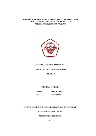 Chin, Hioe (2022) PENGARUH PERENCANAAN PAJAK, ASET TAKBERWUJUD, AFILIASI ASING DI TAX HAVEN TERHADAP PENERAPAN TRANSFER PRICING. Masters thesis, UNIVERSITAS TARUMANAGARA.
