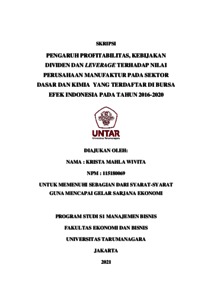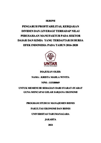 WIVITA, KRISTA MAHLA (2022) PENGARUH PROFITABILITAS, KEBIJAKAN DIVIDEN DAN LEVERAGE TERHADAP NILAI PERUSAHAAN MANUFAKTUR PADA SEKTOR DASAR DAN KIMIA YANG TERDAFTAR DI BURSA EFEK INDONESIA PADA TAHUN 2016-2020. Skripsi thesis, Universitas Tarumanagara.